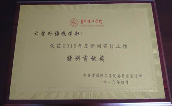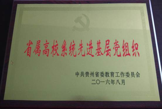 高校“五一”巾帼标兵岗创建单位。2016年7月,校党委表彰一批先进基层党组织和优秀共产党员、优秀党务工作者。大外部党总支被授予“贵州理工学院优秀基层党总支”,苏博同志被授予“贵州理工学院优秀党务工作者”;10月,贵州省委教育工委授予贵州理工学院大学外语教学部党总支“省属高校系统先进党组织”荣誉称号,11月,校党委组织部命名大学外语教学部党总支为“校级五好基层党总支”。