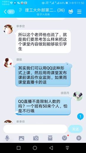 2月5日上午十点,大学外语教学部组织全体教师参加学堂在线开展的“在线教育主题培训系列直播课程”学习,认真聆听了于歆杰老师讲授的“基于雨课堂开展在线授课”课程,并在QQ工作群中开展热烈讨论。老师们围绕教学进度安排、授课内容及时长、如何突出核心知识点、如何实现师生互动、如何监管学生的学习情况、平台服务器能否保证直播顺利进行等问题开展热烈讨论。