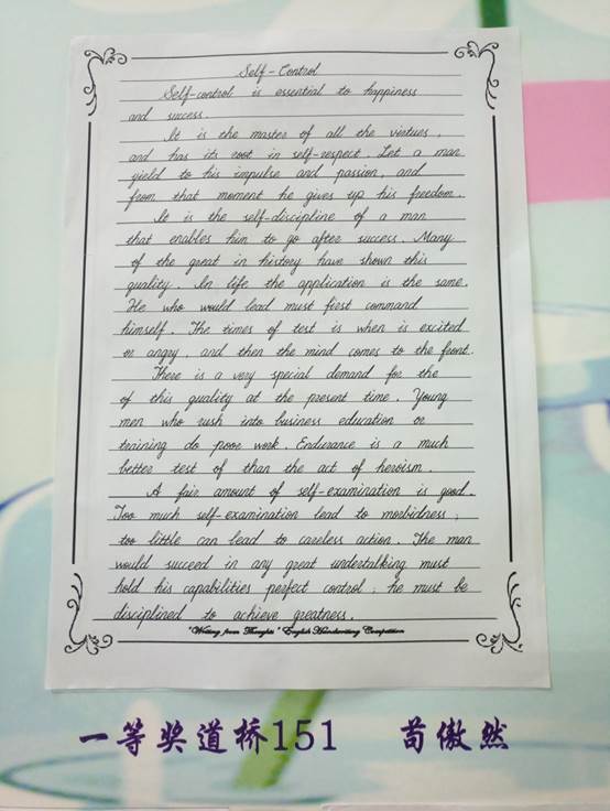 书法非一日之功。通过此次英语硬笔书法比赛,在校园里掀起了一股英语书写风,同学们比学赶超,促进了彼此间的学习与交流,激发了英语学习的热情和活力,为广大学生英语学习营造了良好氛围。