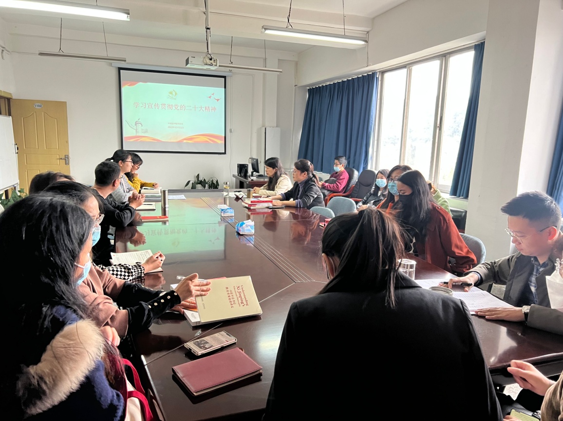 本网讯(外国语学院罗秋梅)为深入学习贯彻党的二十大精神,2022年11月11日上午,外国语学院在综合楼1102会议室召开党的二十大精神宣讲会。学院党总支书记徐焱以“学习宣传贯彻党的二十大精神”为题开展宣讲,学院全体教职工参加了宣讲会。