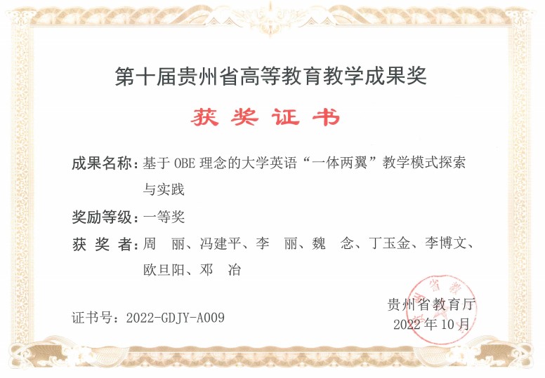 学院自成立以来,荣获贵州省第十届教学成果奖一等奖1项,获批国家级线上一流课程1门、省级“金课”2门、省级一流教学团队(培育)1个、校级重点课程1门,在新华网展播课程思政案例课程1门;教师发表学术论文120余篇(其中核心期刊收录17篇),出版专著7部,主编教材4册,参编教材2部,承担各级各类科研项目30余项(其中省级项目7项),主持横向课题10余项;教师参加校级以及省级教学大赛,累计获奖20余项。