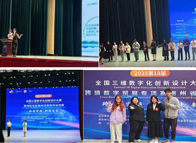 11月1日, 第 18 届全国三维数字化创新设计大赛跨境数字贸易专项赛贵州省省赛在贵州财经大学(花溪校区西区)学生活动中心会堂报告厅圆满落幕。贵州理工学院两支参赛队伍凭借扎实的专业素养、出色的创新能力与默契的团队协作,从众多竞争者中脱颖而出,双双斩获省级二等奖。由数字贸易与商务微专业学子组成的 “智跃队” 表现亮眼,该团队由外国语学院柏兰、祝云丽、蔡国艳、杨胜宁、周思宇五名同学组建,将语言专业优势与数字贸易场景深度结合,通过跨学科实践实现了能力突破。另一支获奖队伍 “化力为翼” 队则在直播赛道中大放异彩,团队以化学工程学院杨易玲同学为队长,队员包括建筑与城市规划学院姜梦萍、闫梦燃及化学工程学院王凤棋、陈云海,实现了多学科背景的优势互补。
