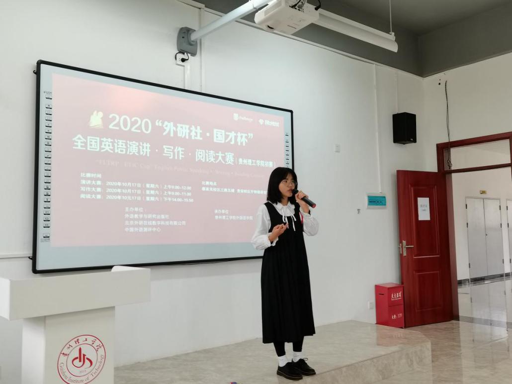 本网讯(外国语学院 单李欣)2020年10月17日,由创新创业中心、外国语学院、人文素质教育中心联合主办的2020“外研社?国才杯”全国英语演讲大赛、写作大赛、阅读大赛贵州理工学院初赛在贵州理工学院蔡家关校区、贵安校区两校区顺利举行。