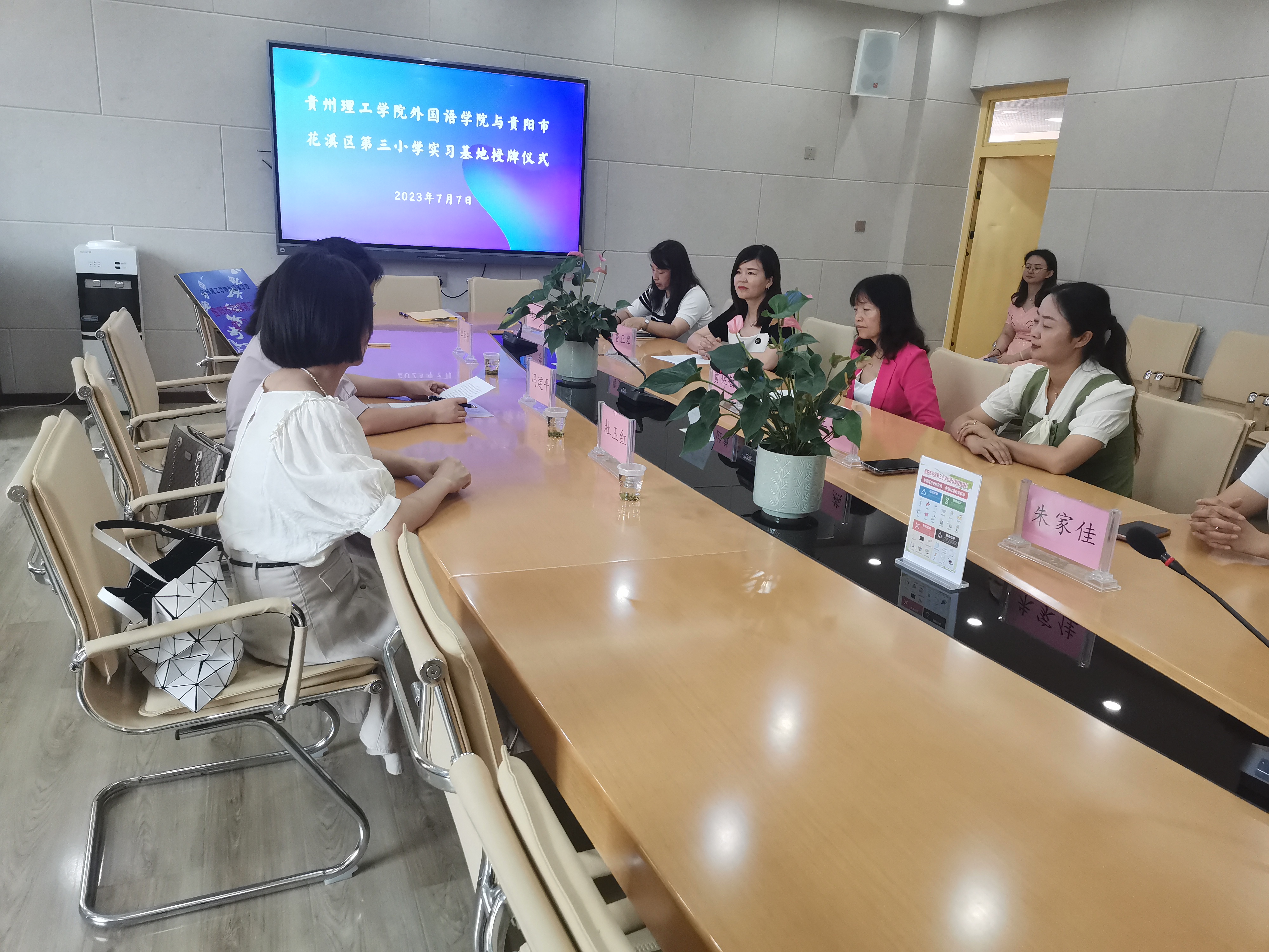 本网讯(外国语学院 单李欣)2023年7月7日,贵州理工学院外国语学院一行到贵阳市花溪区第三小学开展外国语学院英语专业实习基地挂牌暨英语专业学生就业推进会,贵阳市花溪区第三小学贾佐敏校长及相关领导和老师、外国语学院党政负责人及教学科研科负责人参加授牌仪式及交流座谈。