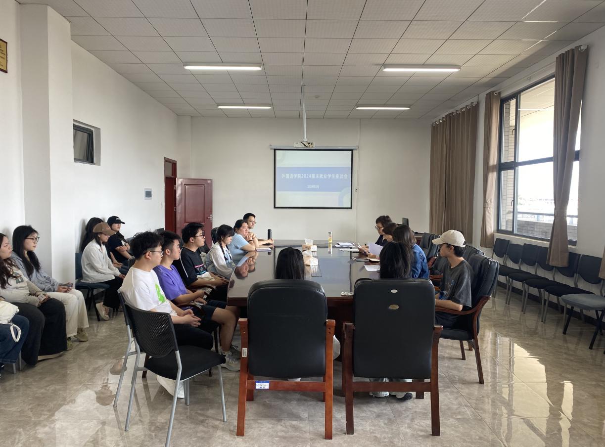 本网讯(外国语学院 黄超禹)为进一步做好我院2024届毕业生就业工作,精准了解毕业生就业需求,促进未就业毕业生就业,外国语学院于5月14日上午在开物楼1524会议室召开了2024届未就业学生座谈会。党总支书记徐焱、院长周丽、党总支副书记杜玉红、毕业班辅导员、班主任及2024届未就业学生参会。