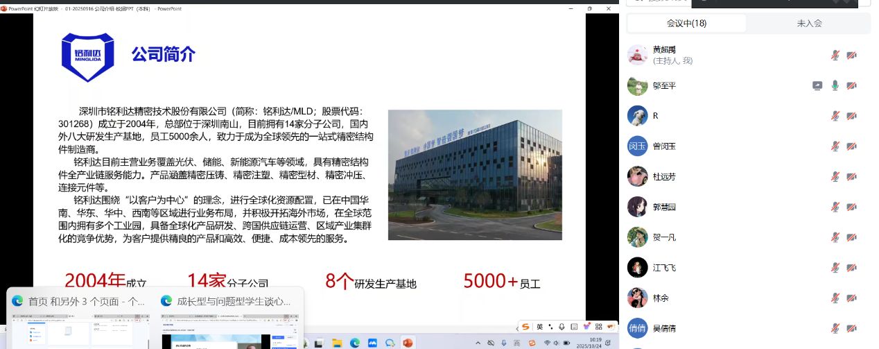 本网讯(外国语学院 黄超禹)为搭建“就业桥梁”,助力我院2026届毕业生充分就业,2025年10月24日上午,外国语学院邀请知名企业深圳市铭利达精密技术股份有限公司通过腾讯线上会议举办英语专业专场招聘宣讲活动。学院就业专员黄超禹以及2026届毕业生参加。