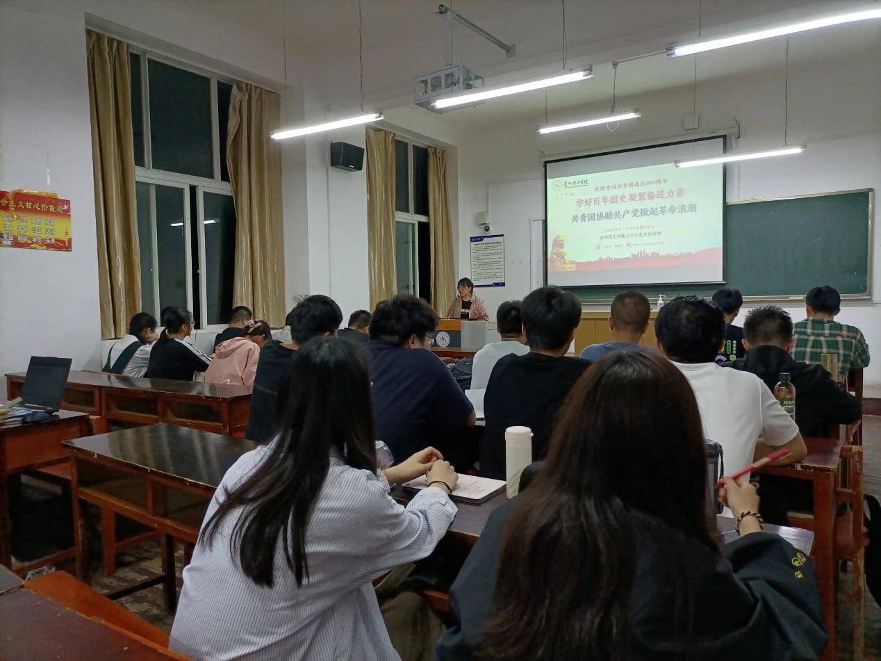 本网讯(外国语学院 郭雅芳)回望百年,青春向党,学习百年团史,崇仰百年精神。4月28日晚,“共青团协助共产党掀起革命浪潮”团史宣讲活动走进国际教育学院在蔡家关校区一教313室开展。本次宣讲由贵州理工学院大学生团史宣讲团成员、外国语学院郭雅芳主讲,电自合201班,电自合202班全体同学参加。