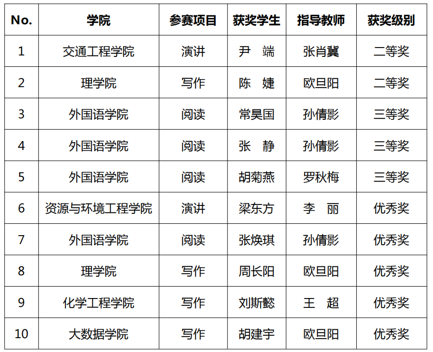 通过与来自全省各高校的优秀学生同台竞技,中国足球彩票:交通工程学院的尹端同学和理学院的陈婕同学分别在演讲和写作比赛中斩获二等奖,外国语学院常昊国、张静、胡菊燕同学获得阅读比赛三等奖。