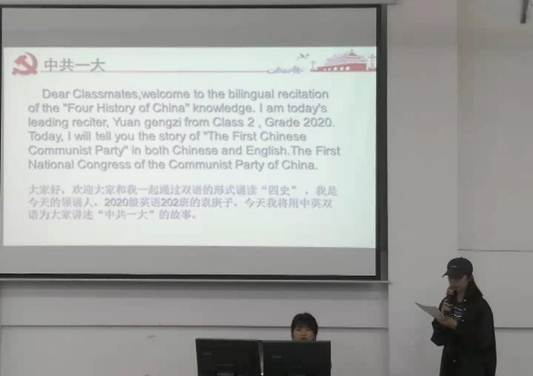 随后,英语202班袁庚子同学带领同学们共同用英文诵读了中共一大的历史简历,《七律长征》,《沁园春·雪》两首红色经典诗词。