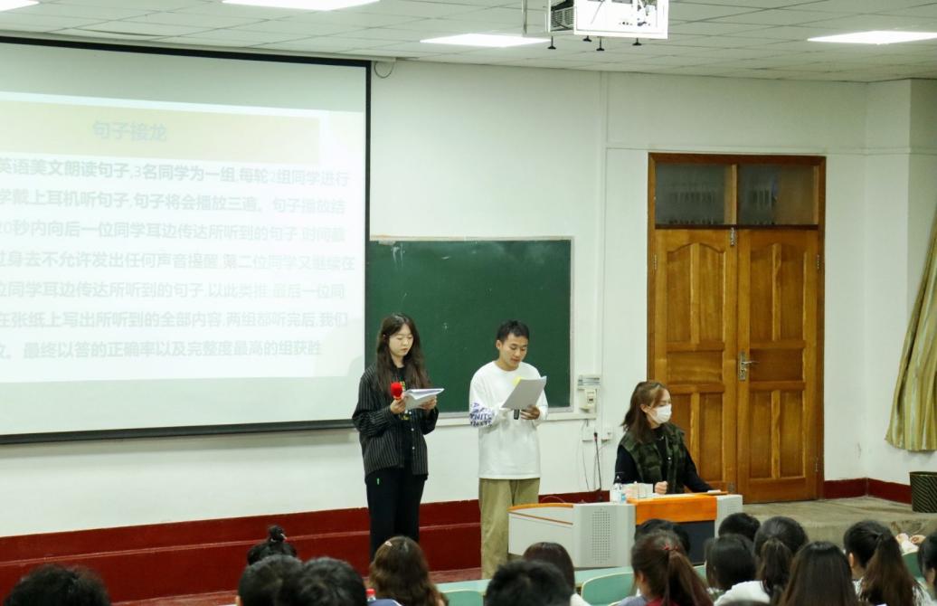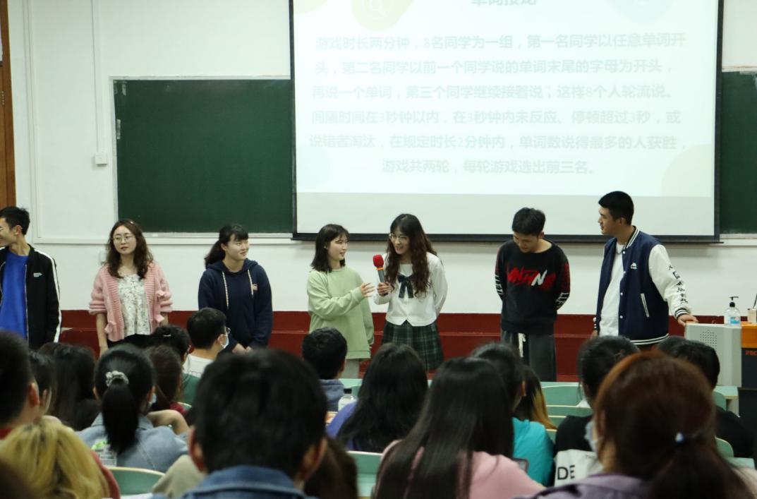 此次活动共分为三个环节,分别是:英文歌曲欣赏、英语趣味游戏互动、以及英语四级考试经验分享。活动伊始,给现场同学推荐了《once upon a time》《pop stars》《love story》等歌曲让大家欣赏,优美动听的旋律将活动拉开帷幕。随后,是英语趣味游戏互动环节,游戏全程采取数字摇号的方式进行游戏互动,每轮游戏都与英语相关,同学们参与度极高,现场气氛十分活跃,同学们体验到了趣味英语学习的乐趣。