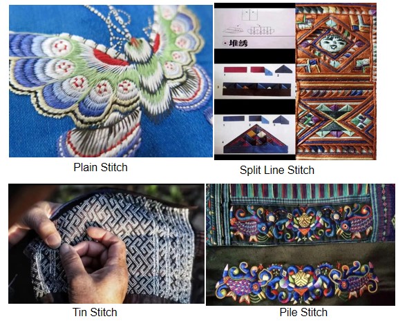 In terms of craft techniques, Miao embroidery employs various techniques such as plain stitch, tin stitch, split line stitch, and pile stitch. Many of these techniques are unique and have been added into the list of China's national intangible cultural heritage.