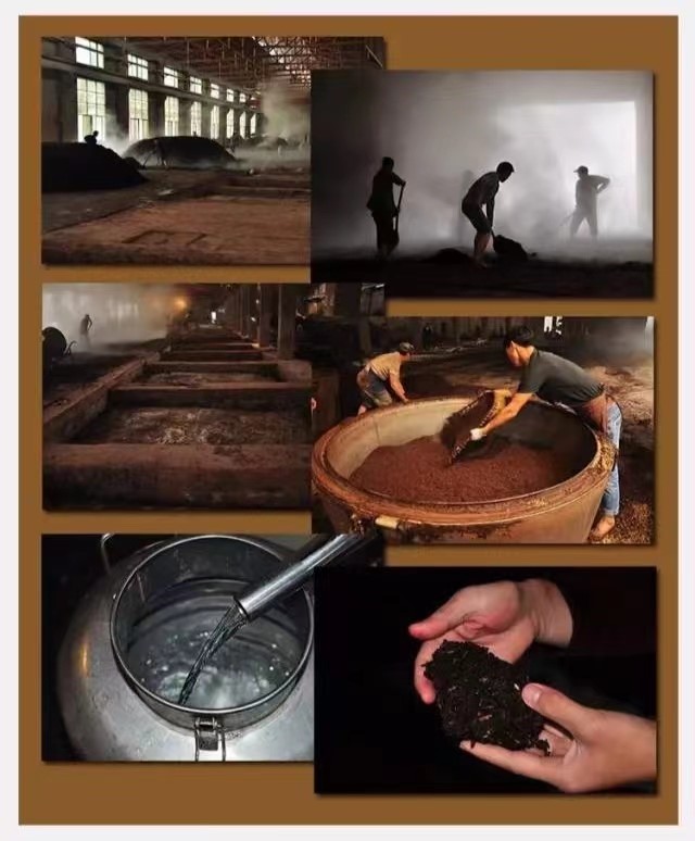 To make Maotai liquor, high-quality wheat is processed into koji powder, which contains enzymes such as amylase, saccharifying enzyme, and protease. This powder acts as a catalyst for forming the flavor components of Baijiu.