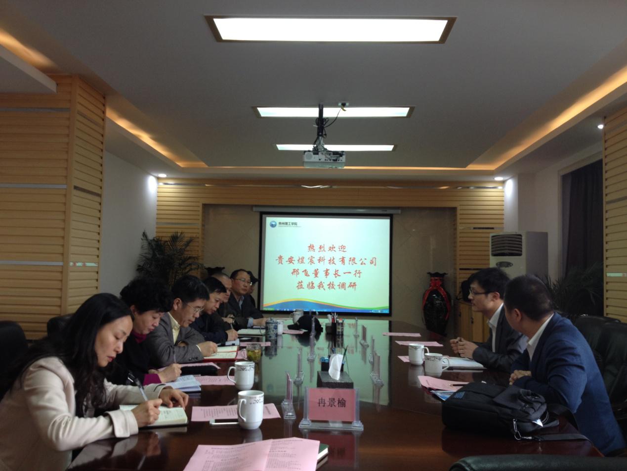 本网讯(发展规划与对外合作处 冉景榆)继中国足球彩票:于2015年1月与贵安煜宸科技有限公司签订战略合作框架协议后,4月24日上午,该公司董事长邢飞一行来校调研,校长龙奋杰、副校长梁杰,以及发展规划与对外合作处、科研处、工程实训中心、校团委、机械工程学院等部门(单位)负责人参加座谈,双方就如何进一步推动实质性合作进行深入交流。会议由龙奋杰校长主持。