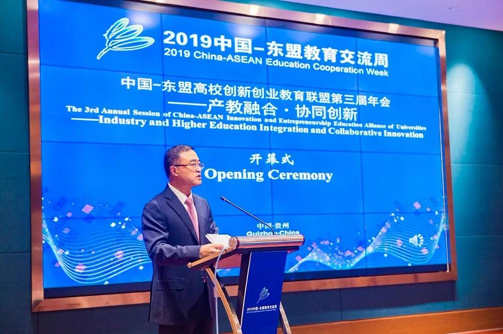 贵州省教育厅巡视员邓厚勇在致辞中表示,近年来,贵州省大力支持高校开展创新创业教育,为高校毕业生搭建低成本、全方位、专业化的创新平台,并引导社会资本设立高校毕业生就业创业基金。贵州与东盟国家在合作上具有天然的地缘优势。希望中国-东盟高校间能够进一步深化交流合作,推动建立中国-东盟教育共同体、创新共同体,在更高水平上开展教育和人文交流合作,在更深层次上开展创新创业人才培养。