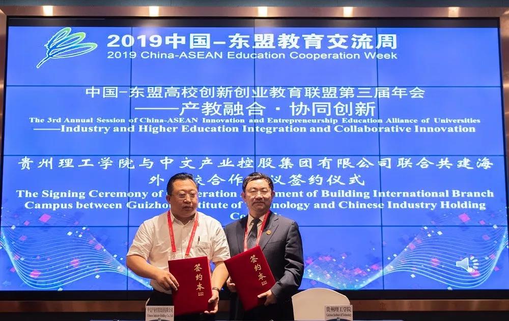 贵州理工学院副院长宋建波宣读了中国-东盟教育交流周组委会执行秘书长刘宝利发来的贺信,举行了贵州理工学院与中文产业控股集团有限公司联合共建海外分校合作协议签约仪式。