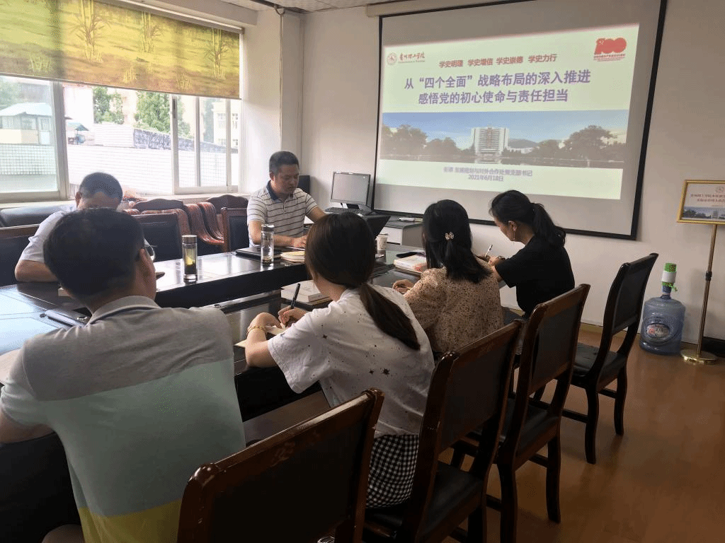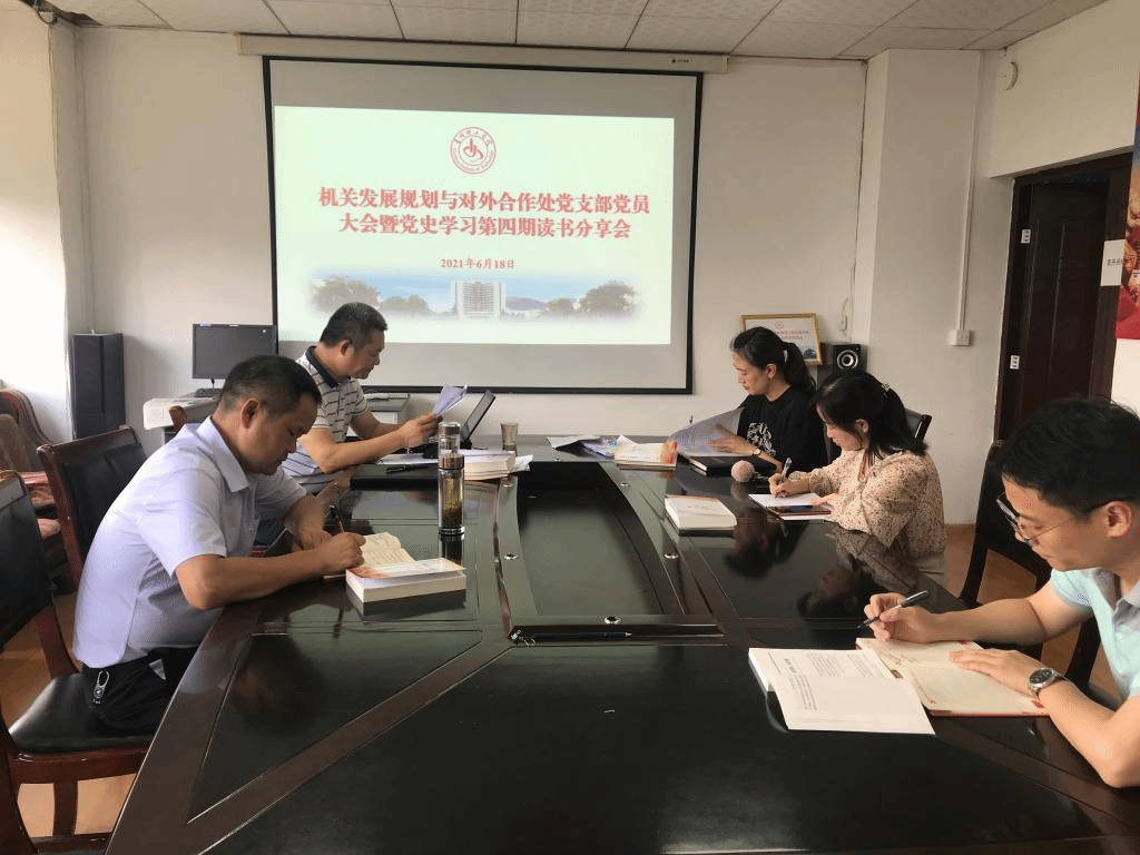 2021年6月18日下午14:00机关发展规划与对外合作处党支部全体党员在行政楼328会议室召开支部党员大会暨党史学习第四期读书分享会,机关党委委员王丽莎出席会议,会议由支部书记彭勇主持。
