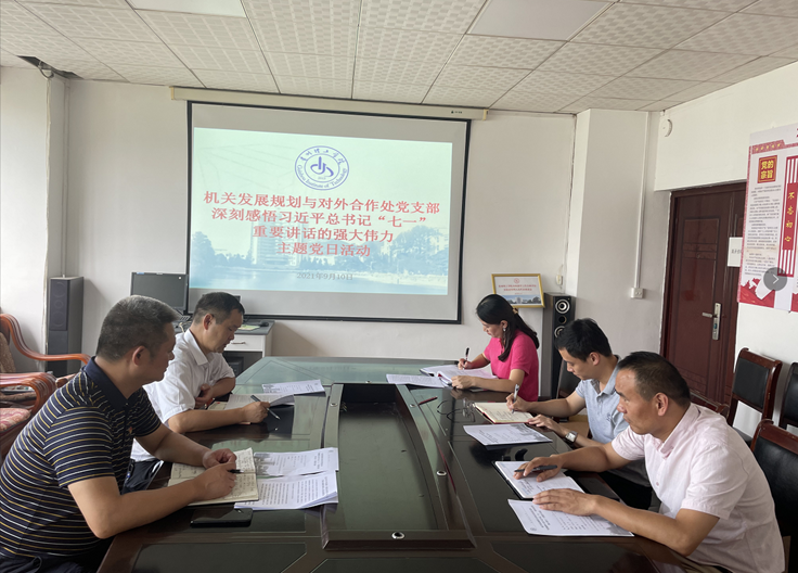 2021年9月10日下午15:00机关发展规划与对外合作处党支部全体党员同志在行政楼328会议室召开“深刻感悟习近平总书记‘七一’重要讲话的强大伟力”主题党日活动。活动由支部书记彭勇主持,支部全体党员同志参加。
