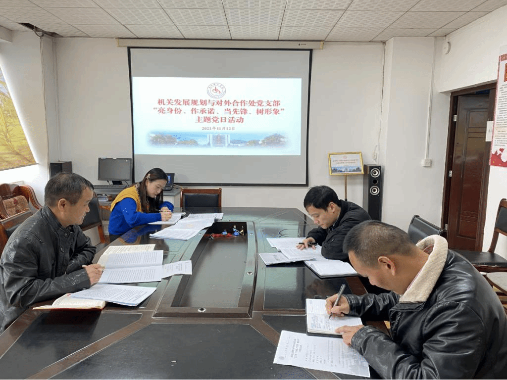 2021年11月12日上午11:00点机关发展规划与对外合作处党支部在行政楼328会议室召开“亮身份、作承诺、当先锋、树形象”主题党日活动。