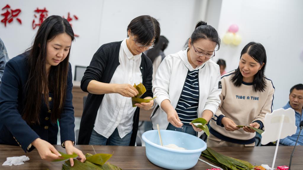 在“巧手包粽”环节,大家沉浸式体验了传统民俗的魅力。现场准备了新鲜的粽叶、雪白的糯米等包粽材料,专业师傅耐心地向大家讲解包粽子的技巧和步骤,并进行示范。大家纷纷动手跃跃欲试,捋粽叶、填糯米、扎棉线……尽管手法略显生疏,但大家热情高涨,互帮互助。时逢六一儿童节,孩子们表演回来加入其间,在欢声笑语中,一个个形态各异的粽子逐渐成形。大家一边包粽子,一边交流着端午习俗,感受着传统文化的深厚底蕴。