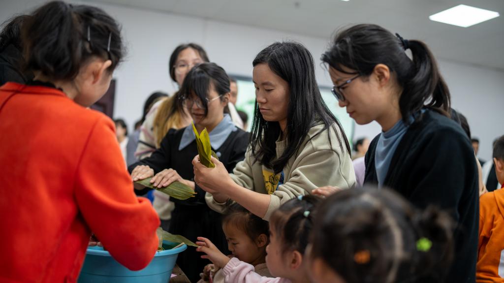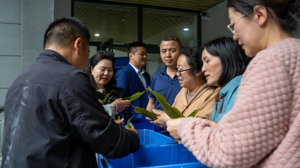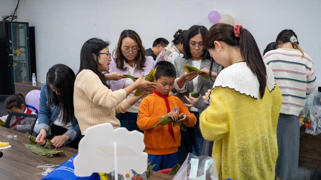 在“巧手包粽”环节,大家沉浸式体验了传统民俗的魅力。现场准备了新鲜的粽叶、雪白的糯米等包粽材料,专业师傅耐心地向大家讲解包粽子的技巧和步骤,并进行示范。大家纷纷动手跃跃欲试,捋粽叶、填糯米、扎棉线……尽管手法略显生疏,但大家热情高涨,互帮互助。时逢六一儿童节,孩子们表演回来加入其间,在欢声笑语中,一个个形态各异的粽子逐渐成形。大家一边包粽子,一边交流着端午习俗,感受着传统文化的深厚底蕴。