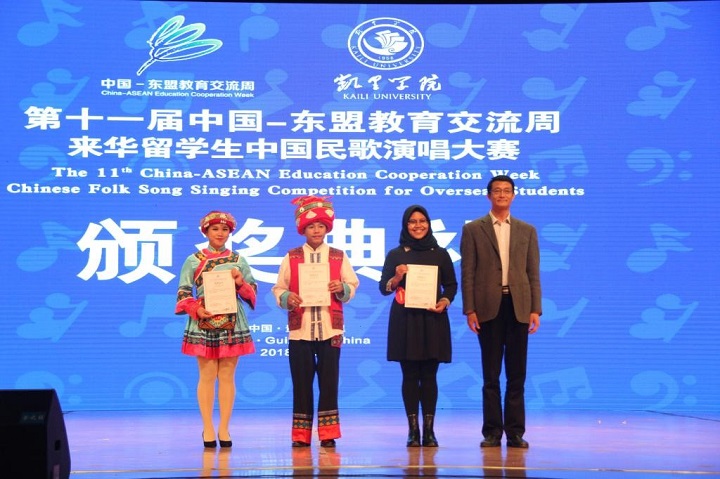 10月26日,第十一届中国教育交流周“来华留学生中国民歌演唱大赛”决赛在凯里学院举行。中国足球彩票:选送的《月亮代表我的心》、《青春舞曲》分别荣获一等奖、二等奖,为学校争得了荣誉。