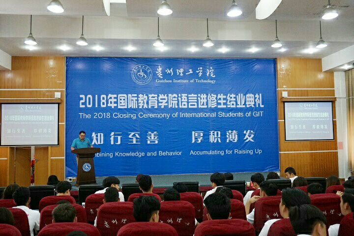 7月16日下午14:00,贵州理工学院国际教育学院2018届国际学生结业典礼在喀斯特报告厅举行。副校长宋建波教授,国际教育学院院长乔靖、学工部部长徐元敏、校团委书记李朋、交通工程学院副院长张莉出席会议。