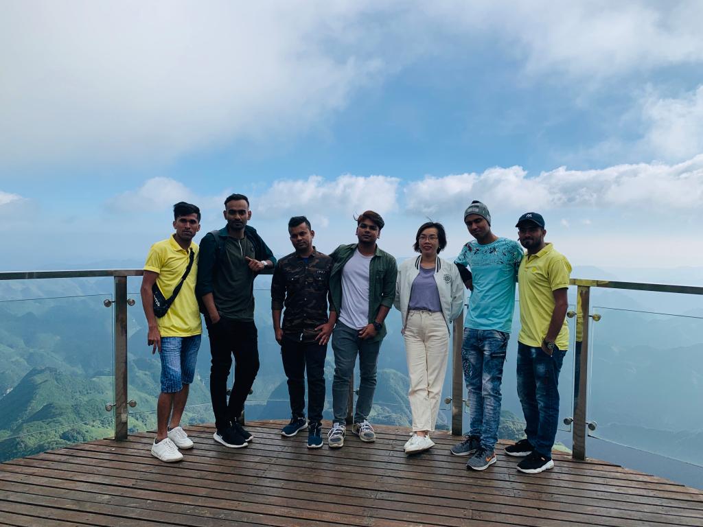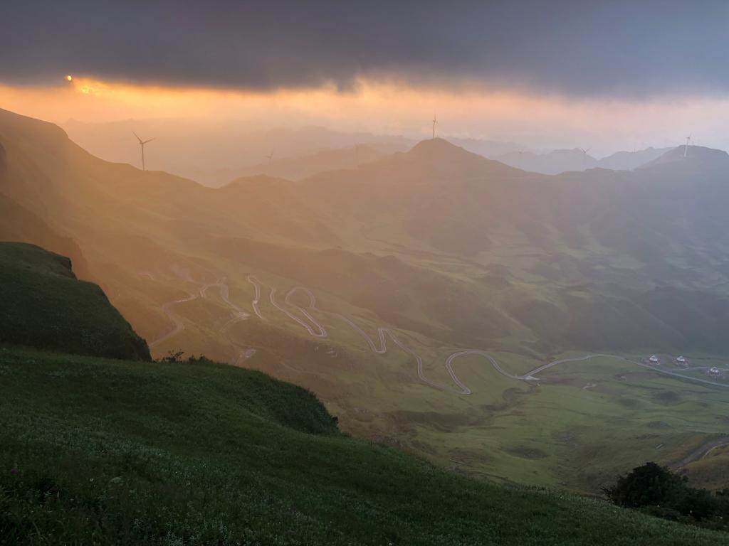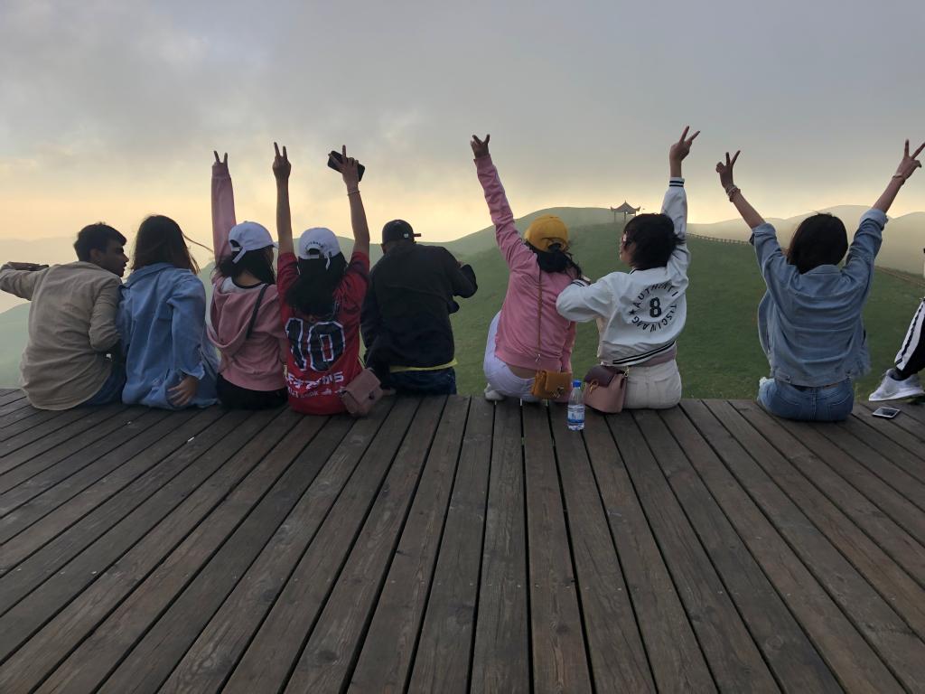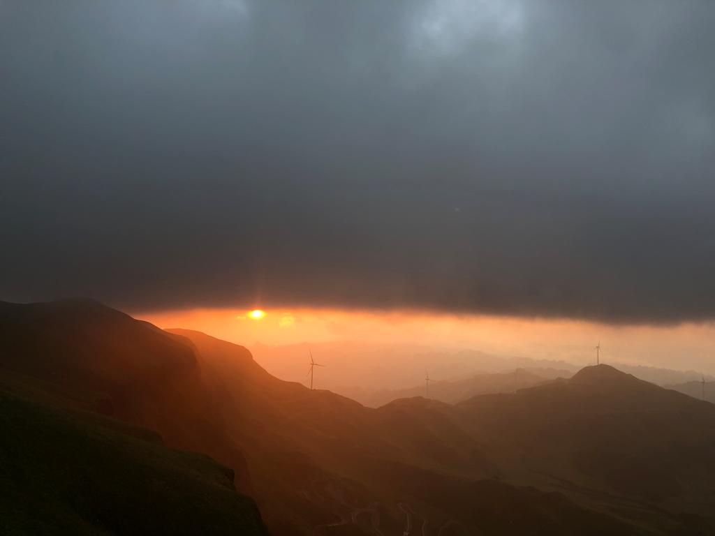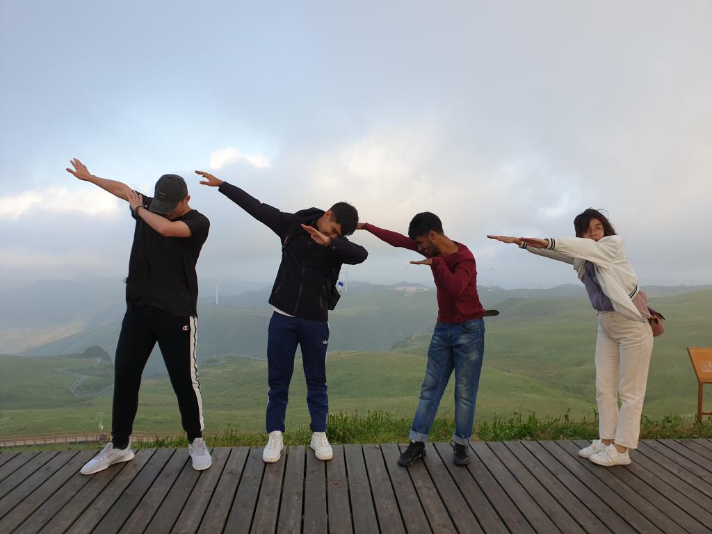 早上5:00同学们就起床去爬山看日出,等天边霞光一点点穿破云层透露出来,同学们的手机按个不停。虽然咱们拍摄技术有限,但在贵州屋脊看日出确实别有一番韵味,特别是当清晨的第一缕阳光,照在韭菜花上,被一点点映红时,山顶也明亮起来。乌兹别克斯坦同学周大智说,如果不是身临其境,你根本无法感受它到底有多美。孟加拉的沙尔兰同学说,中国人太聪明了,你看看在悬崖上的木栈道、山顶的风力发电风车,真不知道他们是怎么建的,我要向他们学习,回国去建,发展我们国家的旅游和经济。