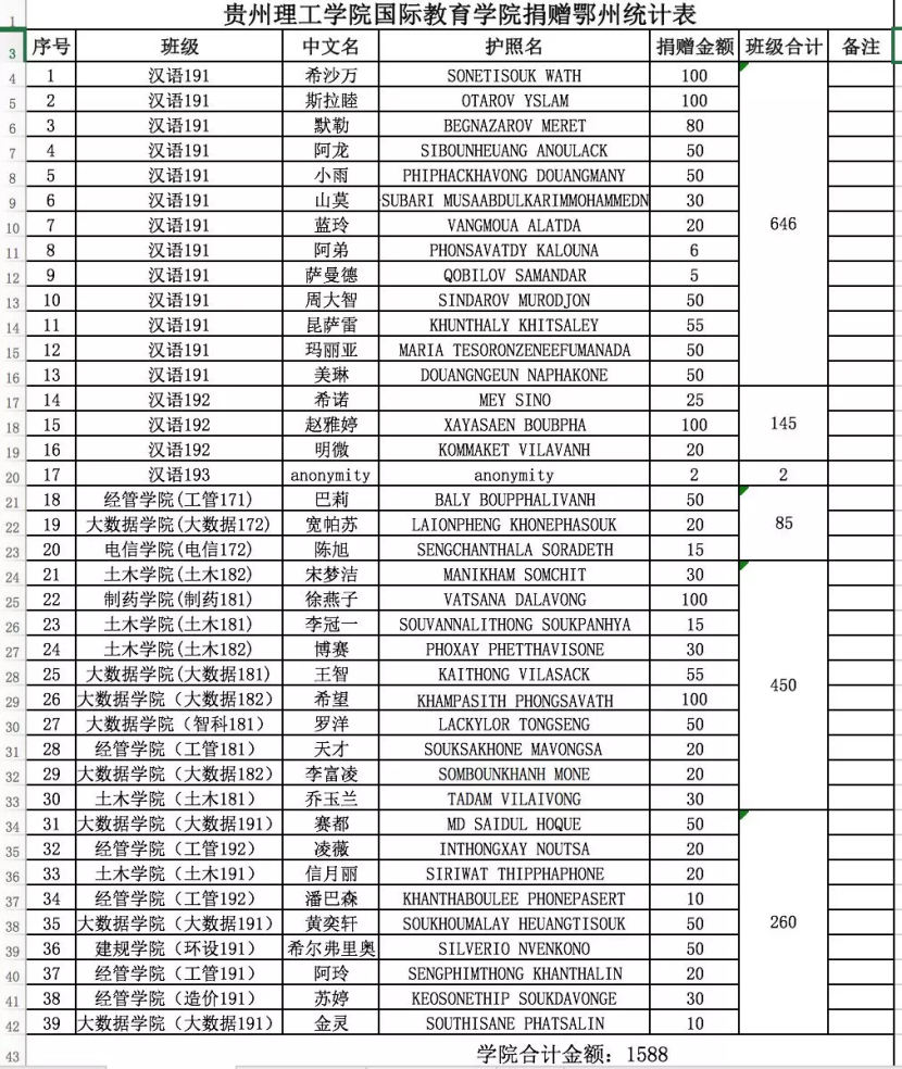截止2月25日12:00,国际教育学院国际学生累计捐款1588元,其中语言生793元,学历生捐款795元。