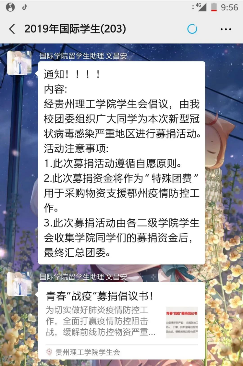 自倡议书发布之日起,贵州理工学院各二级学院学生会纷纷组织各班班委向广大同学宣传,各班同学积极参加募捐,自愿为鄂州抗疫伸出援手。