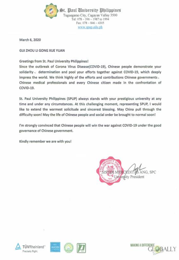 菲律宾圣保罗大学校长在信中表示:“自新型冠状病毒爆发以来,中国人民展现出的众志成城令世界人民印象深刻,我们高度评价中国政府、医疗专家和每一名中国人对疫情防控做出的贡献和努力。圣保罗大学在任何时候和任何情况下都与贵校站在一起。在这充满挑战的时刻,我谨代表SPUP,向您致以最热烈的关怀和最诚挚的祝福。祝福中国早日渡过难关!愿中国人民的生活和社会秩序早日恢复正常。”