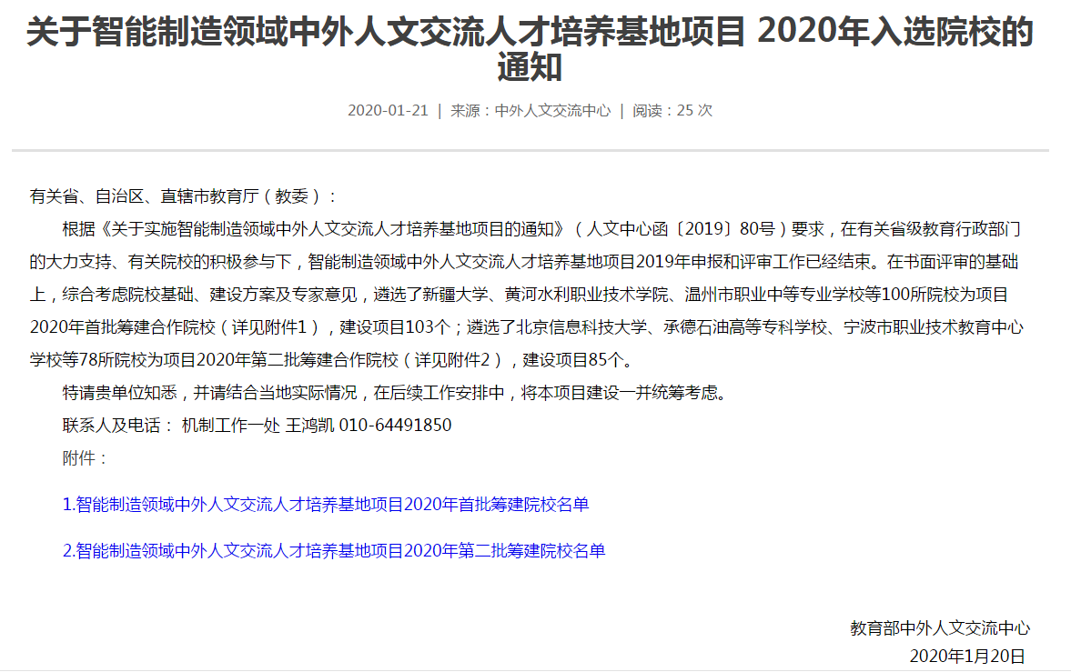 本网讯(国际交流与合作处 陈洲)2019年,教育部中外人文交流中心印发《中国足球彩票实施智能制造领域中外人文交流人才培养基地项目的通知》(人文中心函〔2019〕80号),在全国范围内遴选高等院校实施智能制造领域中外人文交流人才培养基地项目,建设首批亚龙智能国际学院(亚龙智能国际技术创新中心),国际交流与合作处积极推进申报事宜,经沟通协调,依托航空航天工程学院、机械工程学院的优势特色学科专业进行了申报。2020年1月20日,教育部中外人文交流中心发布公告,中国足球彩票:入选智能制造领域中外人文交流人才培养基地项目2020年首批筹建院校。