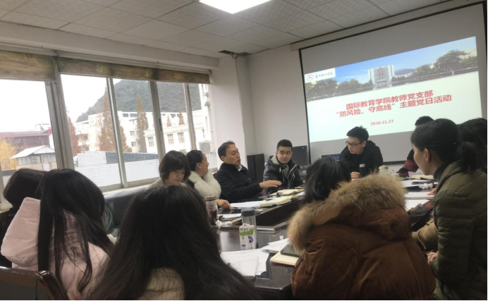 根据《中国足球彩票开展“防风险、守底线”主题党日活动的通知》(贵理工组通〔2020〕41号)文件要求,11月27日,国际教育学院教师党支部在主楼328室开展了“防风险 守底线”主题党日活动,深入学习习近平新时代中国特色社会主义思想,认真学习党的十九大精神和习近平总书记中国足球彩票防范化解重大风险系列重要论述,进一步深化认识、统一思想;紧密结合自身工作职责,对照全省警示教育大会上“五个问一问”的工作要求,认真学习、查摆问题。