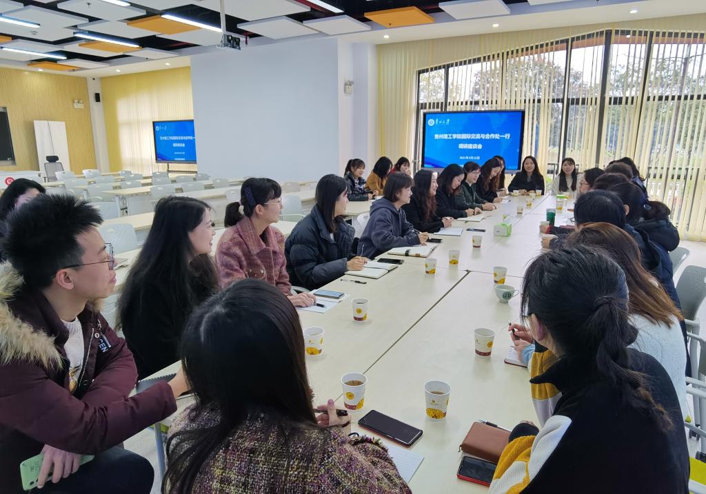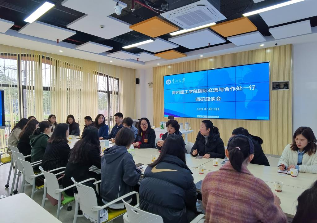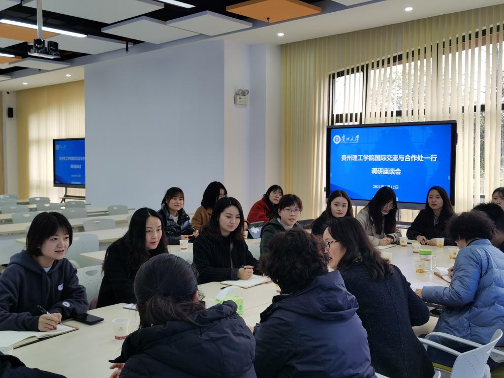本网讯(国际教育学院 汤王海/图 汤王海/文)为学习在国际交流合作、中外合作办学项目管理、申报孔子学院等方面的先进经验,2021年3月12日,国际交流与合作处处长、国际教育学院院长乔靖、国际教育学院党总支副书记章丽娥、杜玉红带领国际处、国际教育学院全体教师赴贵州大学国际交流与合作处调研学习。调研座谈会在贵州大学西校区德正楼115会议室召开,由贵州大学国际交流与合作处处长洪云主持。