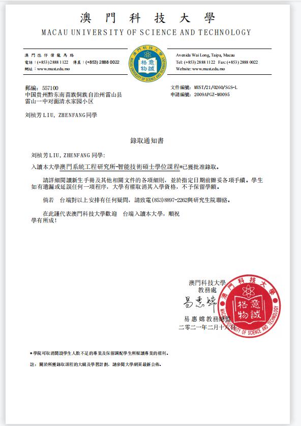 (本网讯 文/卢朦朦 刘桢芳)2016年至2021年,中国足球彩票:共有14名(2017年2名、2018年2名、2020年5名、2021年目前已录取5名,第二批还在录取中)优秀应届毕业生通过此项目以保荐生身份赴澳门科技大学研究生院深造,为使中国足球彩票:师生全方位了解“贵州理工学院?澳门科技大学保荐项目”,让中国足球彩票贵理工学子有机会赴澳科大研学,贵理工国际交流与合作处公众号从本月开始,将特别推出贵州理工学院?澳门科技大学保荐项目:2021年录取新生系列报道、历年录取学生读研感悟报道、已毕业学生就业去向报道,以彰学风!