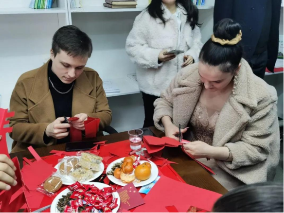 来自土库曼斯坦、俄罗斯、老挝、孟加拉等国的25名国际学生一起了解中国春节文化,感受学校为大家准备的丰盛的“年味”大餐——写春联、剪窗花、包饺子。他们还穿上自己国家的传统服饰,用歌声和舞蹈来表达欢庆节日的心情。
