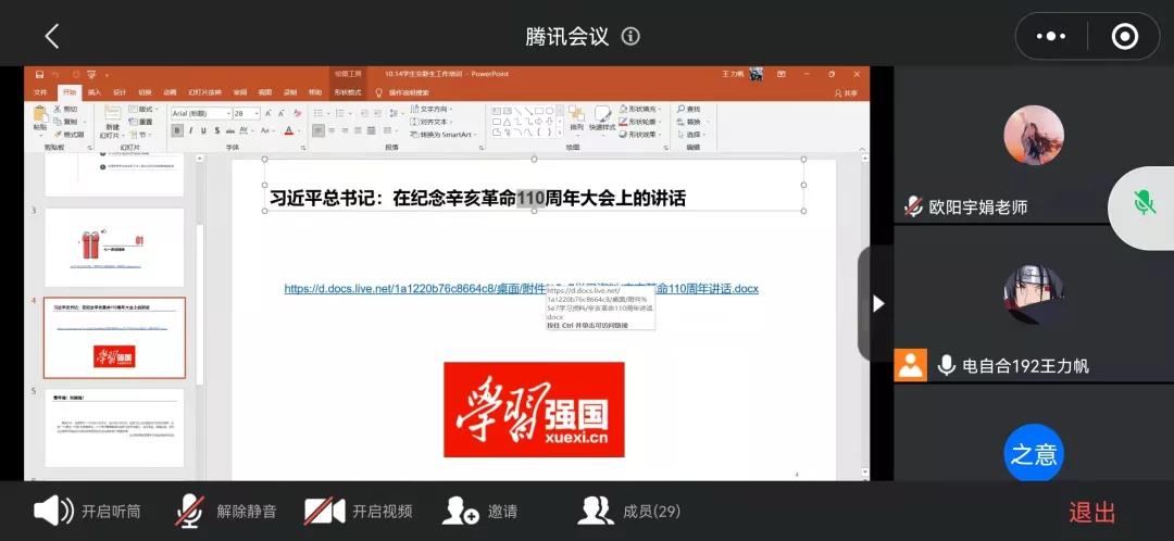 会议首先组织全员学生干部学习习近平总书记七一重要讲话精神和纪念辛亥革命110周年大会上的重要讲话精神和核心内容,学生干部主动参与到学习中来,大家通过不断的学习进一步加强团组织、学生会的凝聚力、提升活力。新任学生干部们表示作为新时代中国青年,无论在工作还是学习中都保持满腔热血,同心向党,不负时代使命。