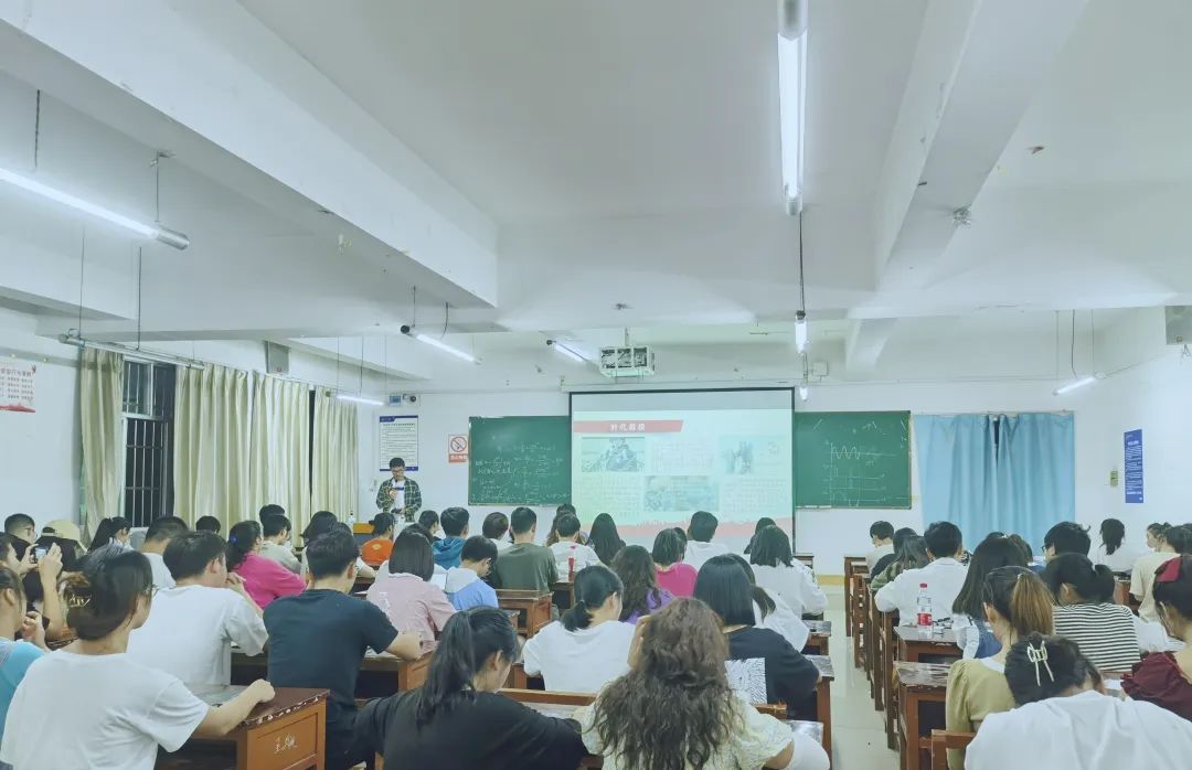 为庆祝中国共青团成立100周年,2022年5月6日晚,校大学生党史宣讲团成员、国际教育学院学生团总支副书记熊贤强在2-413教室,为外国语学院20级学生进行主题为“永远跟党走 传承红色精神”的宣讲活动。
