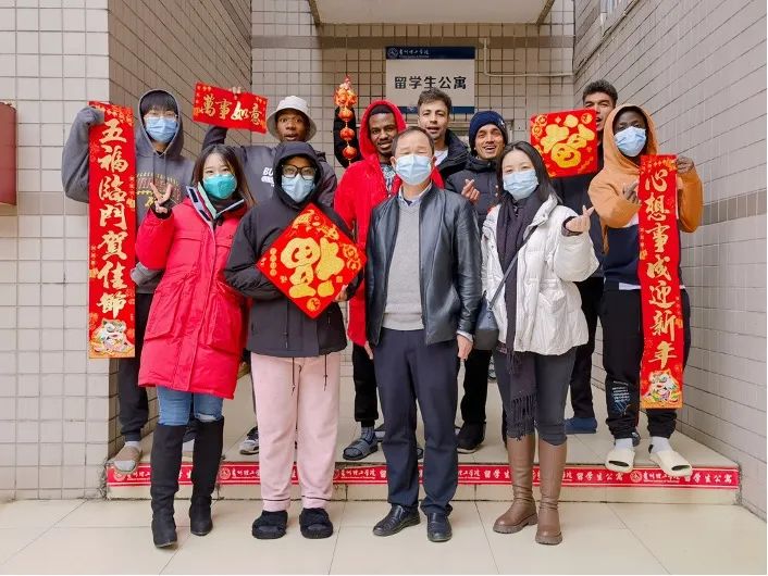 1月17日下午,在新春佳节来临之际,副校长林长松前往学生宿舍走访慰问寒假留校国际学生,国际教育学院相关负责人和管理教师陪同,为他们送去节日问候和新年祝福。林长松副校长仔细询问了国际学生们的生活和学习情况,并向留学生们赠送了春联、笔记本、春节挂饰、汤圆和口罩等新春大礼包,并提醒他们注意宿舍用水用电安全,叮嘱他们在寒假期间做好行程报备,注意个人健康和人身财产安全,如果有困难及时向学校反映,并鼓励同学们利用好寒假,度过一个安全、充实和有意义的寒假,祝福大家新春快乐,兔年吉祥。