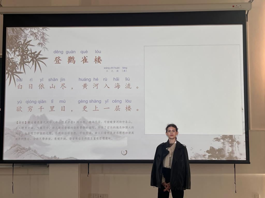 “诗词是跨越国界的语言,它承载着人类的情感与智慧,无论我们来自何方,都能在诗歌中找到共鸣。”随着黎娟老师一段开场白,拉开了诗歌盛宴的序幕。随后,黎老师精心挑选了一系列中国经典诗词,逐字逐句地解析诗词的意境、修辞手法及背后的文化寓意,让国际学生们不仅理解了诗句的字面意义,更深刻体会到了诗中所蕴含的情感与哲思。她特别选取了《静夜思》等作为例子,通过生动的讲解,让学生们仿佛穿越时空,亲身体验了李白在月光下思念家乡的那份孤寂与深情。黎娟老师还鼓励学生们尝试用自己的语言表达对诗词的理解,这不仅锻炼了他们的语言表达能力,也加深了对中国文化的认识。活动的高潮部分是国际学生们轮流上台朗诵自己喜爱的中国诗词,他们或激昂或婉转的诵读,赢得了在场师生的阵阵掌声。