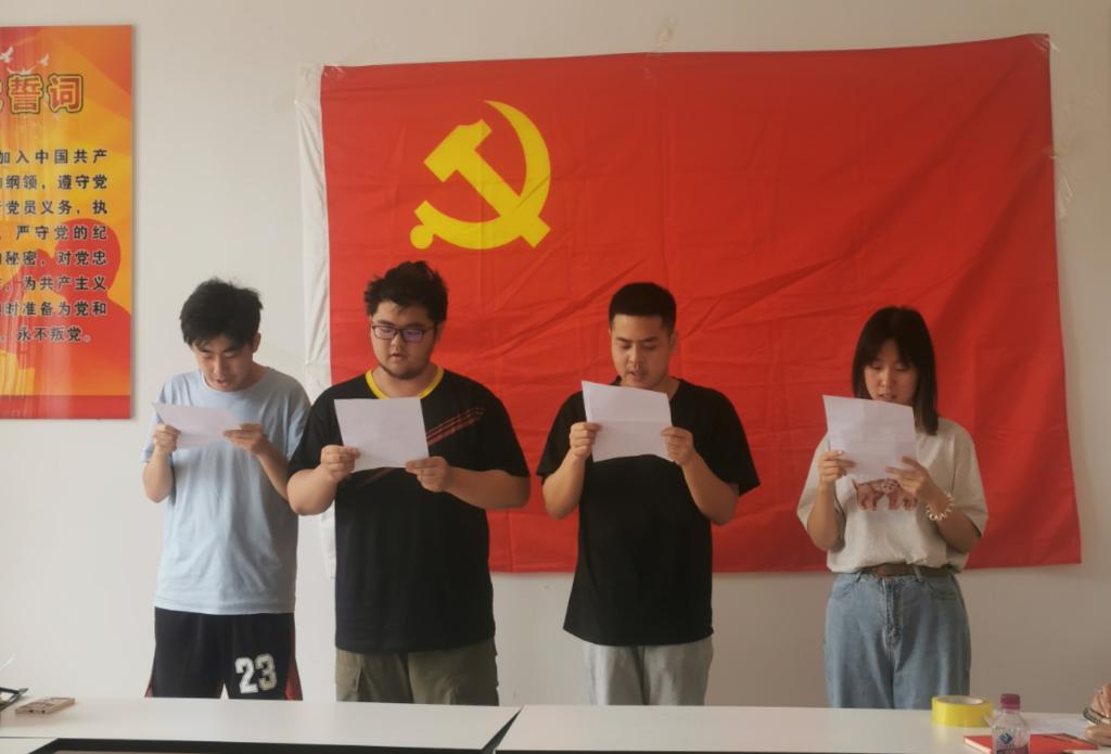最后,学生预备党员韩颖同志、蹇骐彦同志、刘航瑞同志和张文同志集体朗诵《红船的方向》,热情讴歌了与共产党人时刻同在的红船精神。