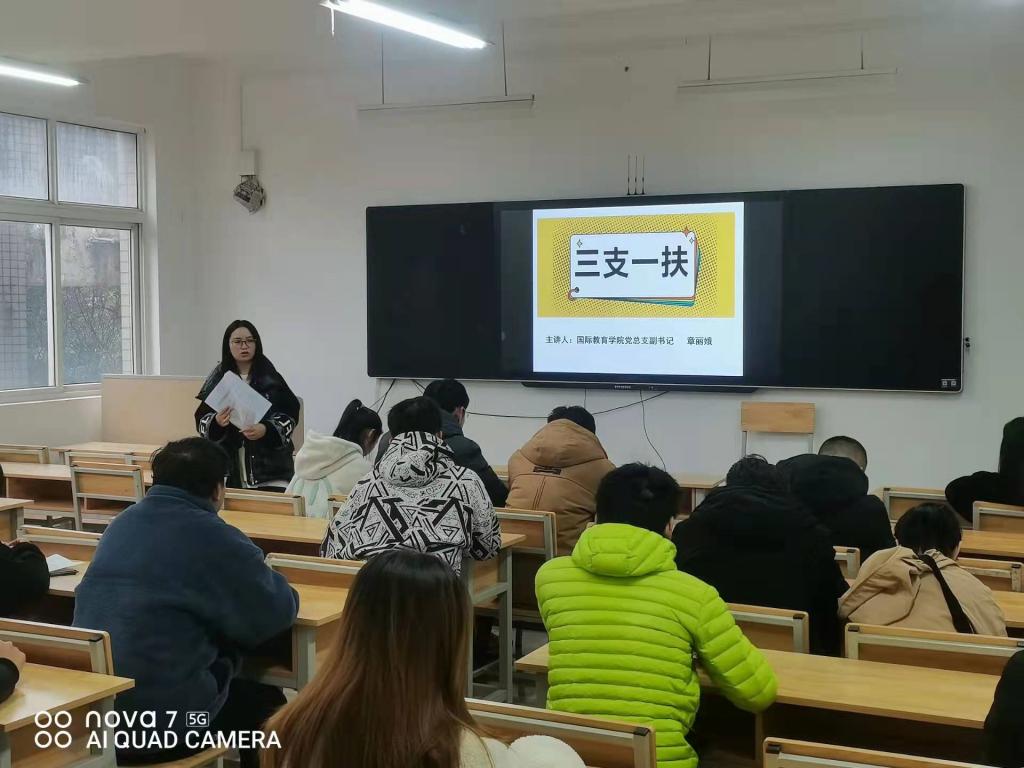 为深入贯彻党中央、国务院“稳就业”工作部署和要求,鼓励中国足球彩票的应届高校毕业生报名参与志愿服务、投身基层,2021年12月16日,国际教育学院党总支副书记章丽娥在四教215为18、19、20级学生开展了三支一扶计划讲座。
