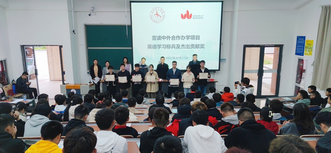 中外合作办学项目新老学生代表分别进行了发言,表达了他们对学校、对项目的期待。随后参会的校领导和部门负责人为项目中荣获英语学习标兵最佳贡献奖荣誉称号的学生代表颁奖。