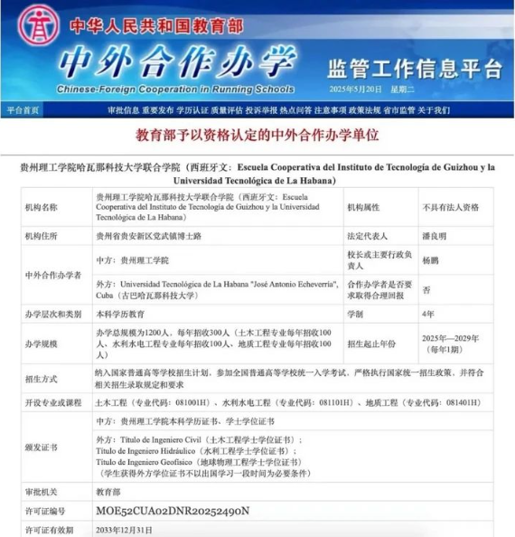 近日,教育部中外合作办学监管工作信息平台传来喜讯:贵州理工学院与古巴哈瓦那科技大学合作设立的贵州理工学院哈瓦那科技大学联合学院正式通过教育部资格认定,成为贵州理工学院首个获教育部批准成立的中外合作办学机构,是中拉首批工程类合作办学机构,也是全国为数不多用西班牙语授课的工程类中外合作办学机构,为中拉文明互鉴与科技教育融合开辟了全新路径。
