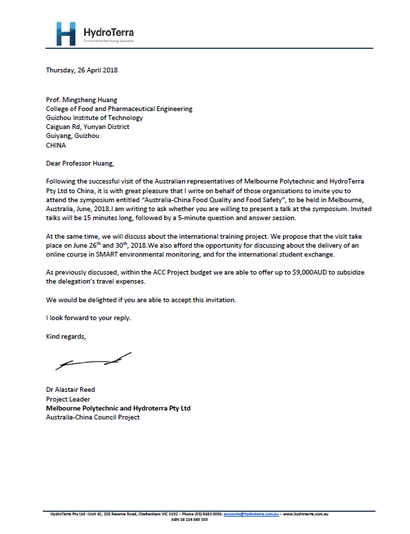 | 上午:参加“澳大利亚-中国食品质量及食品安全”研讨会并做主题为“贵州特色果酒酿造中的质量控制”的报告