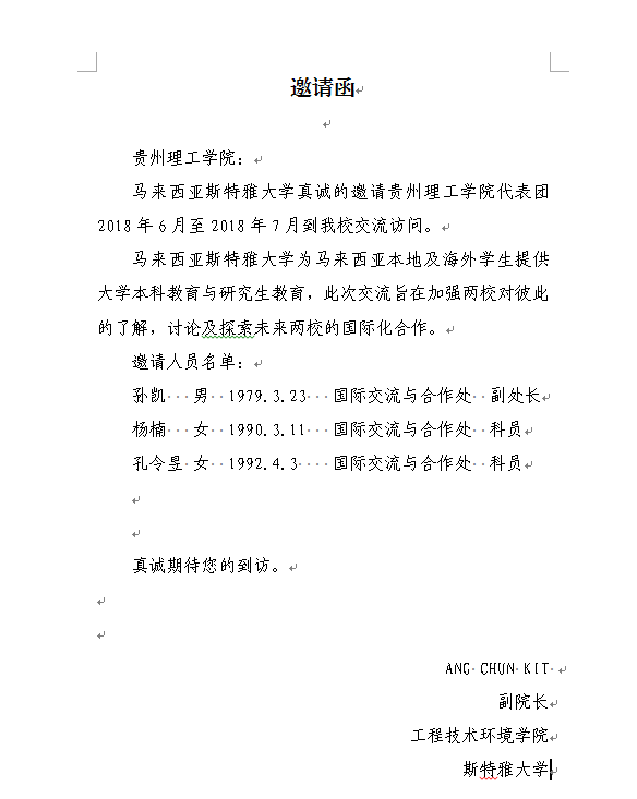 根据中央、国务院出台的因公出国(境)管理工作有关规定,现对贵州理工学院孙凯等3人赴马来西亚执行交流访问及留学生招生宣传任务公示如下: