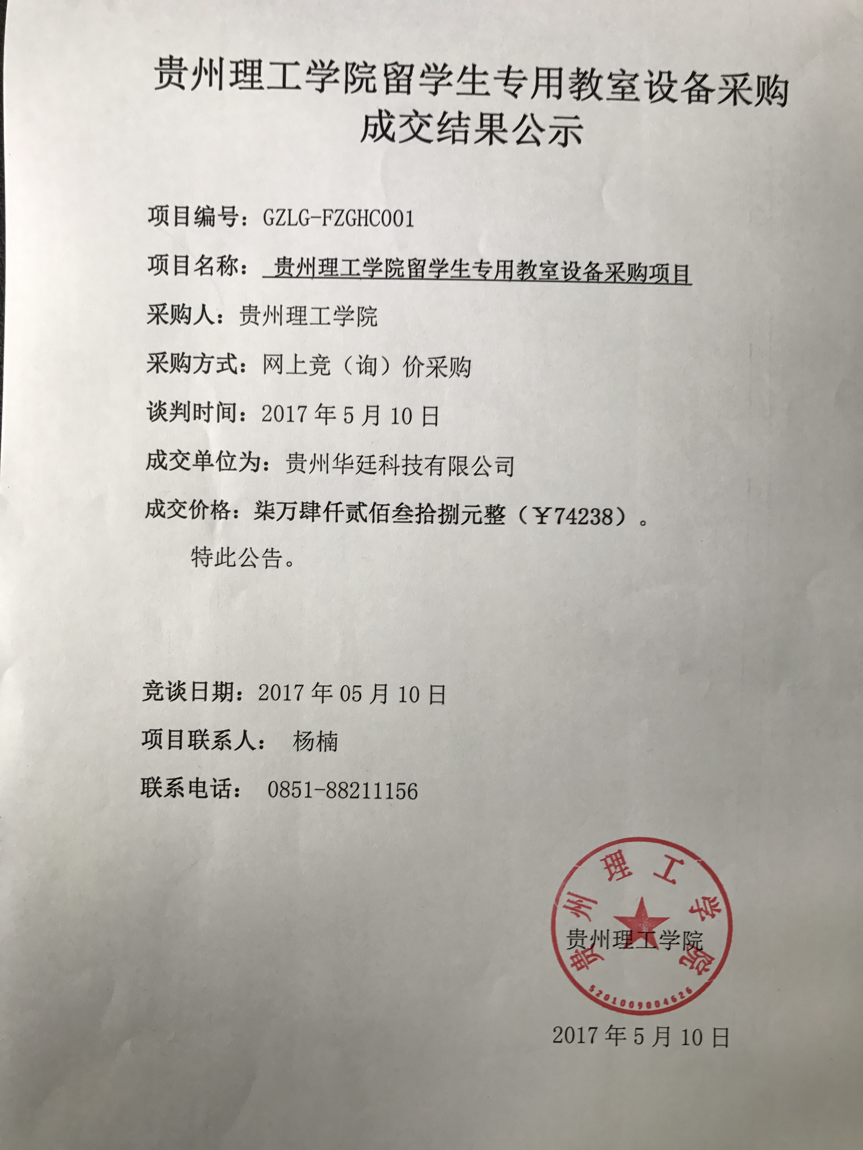 贵州理工学院留学生专用教室设备采购成交结果公示