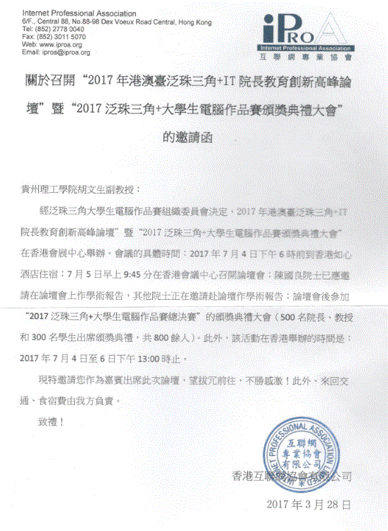 | 2017年泛珠三角+IT院长教育创新高峰论坛会计划于今年7月4-6日在香港举行,同时在香港参加2017泛珠三角+大学生计算机作品“中星杯”总决赛的颁奖典礼大会。将邀请贵州省计算机协会会员单位中的各本科院校和高职高专院校IT方面的领导(含书记、正副院长、正副系主任、正副教研室主任、学科带头人等)参加。