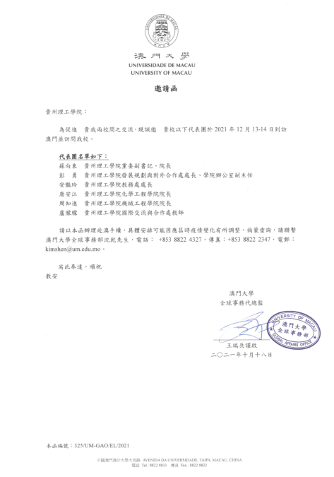 上午:与澳门大学校领导及相关学院院长座谈,交流研究生保荐项目、学生短中长期交流等合作事宜。 下午:走访澳门大学实验室,商讨科研合作可能性。 |