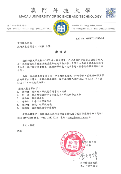 上午:与澳门科技大学博雅学院进行座谈,推进学生短中长期交流项目。 下午:走访澳门科技大学实验室,商讨科研合作可能性。 |
