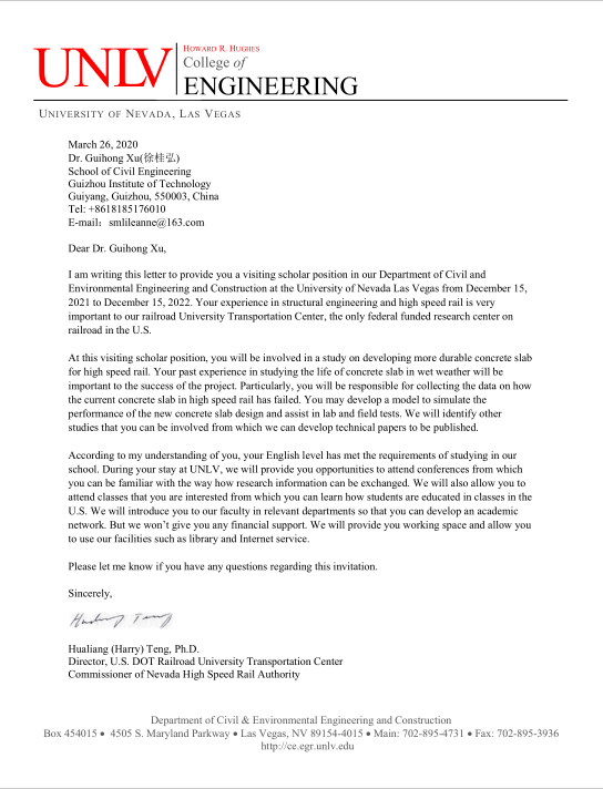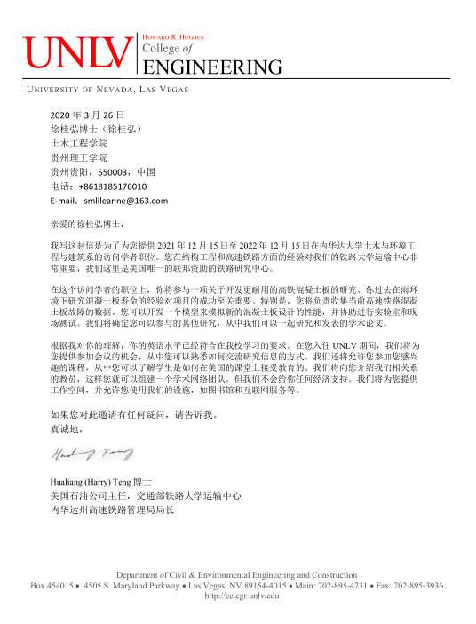 在达内华达州立大学拉斯维加斯分校铁路运输中心进行访学活动。研究领域为:混凝土轨道板在高速荷载作用下的受力性能分析。研究方法:通过室内试验、现场测试等方法研究混凝土轨道板的受力性能、耐久性能。通过采用有限元分析等方法与现场测试结果对比分析,研究高频重载作用下,混凝土构件的受力性能、疲劳性能。 |